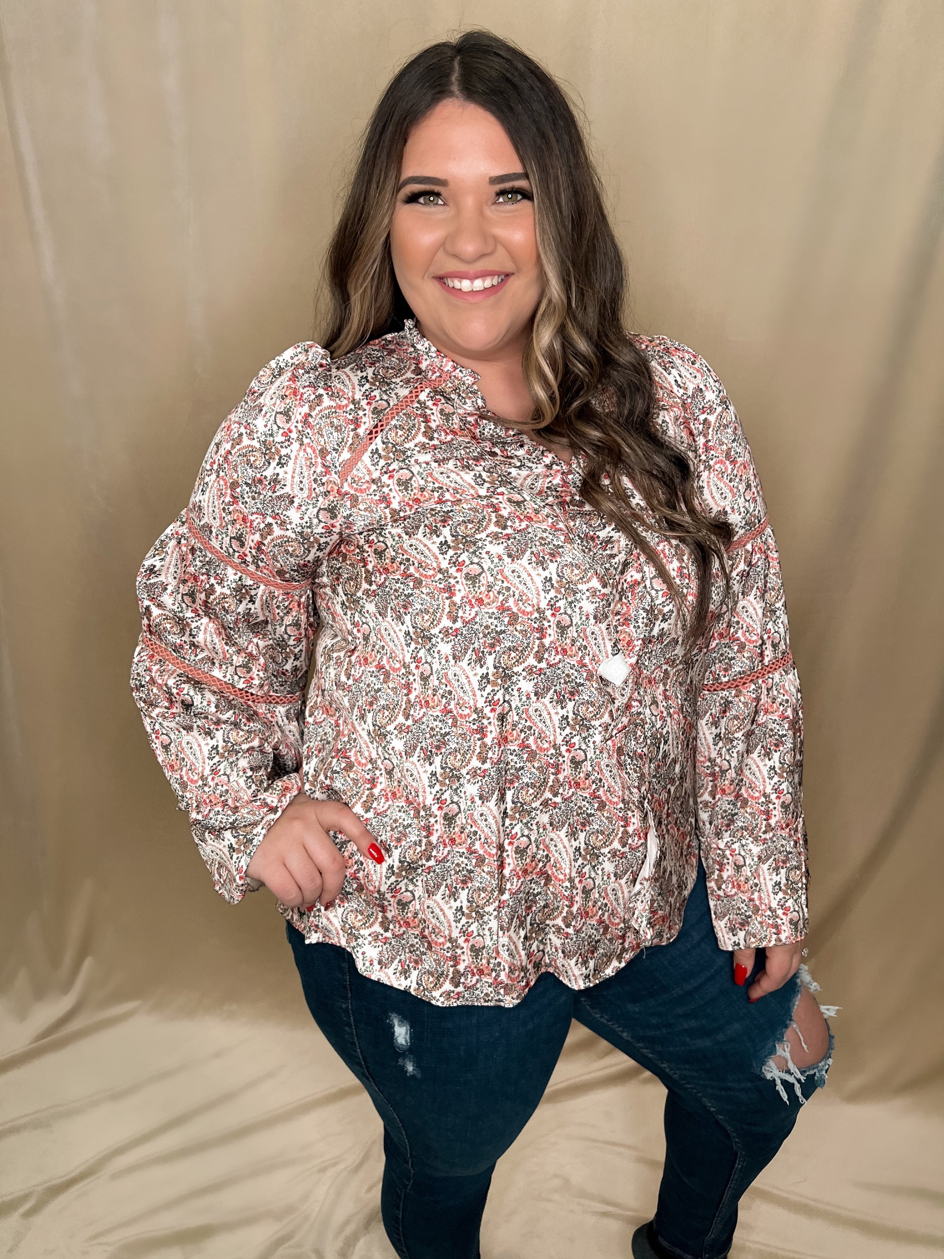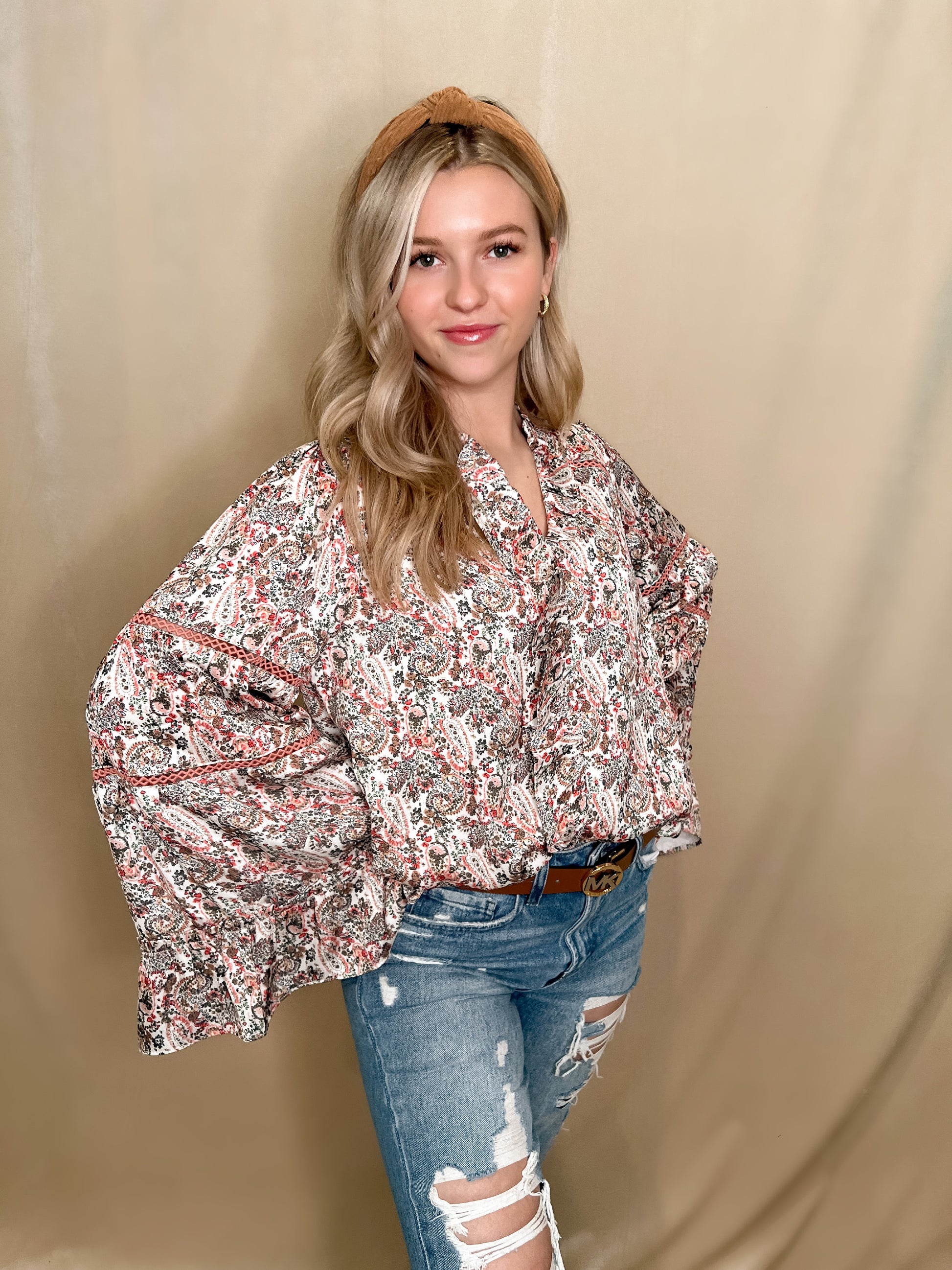 Fun and flirty is the only way to describe this beauty. This Paisley top is one of a kind. Between the pattern and the Flare sleeves you are sure to stand out.